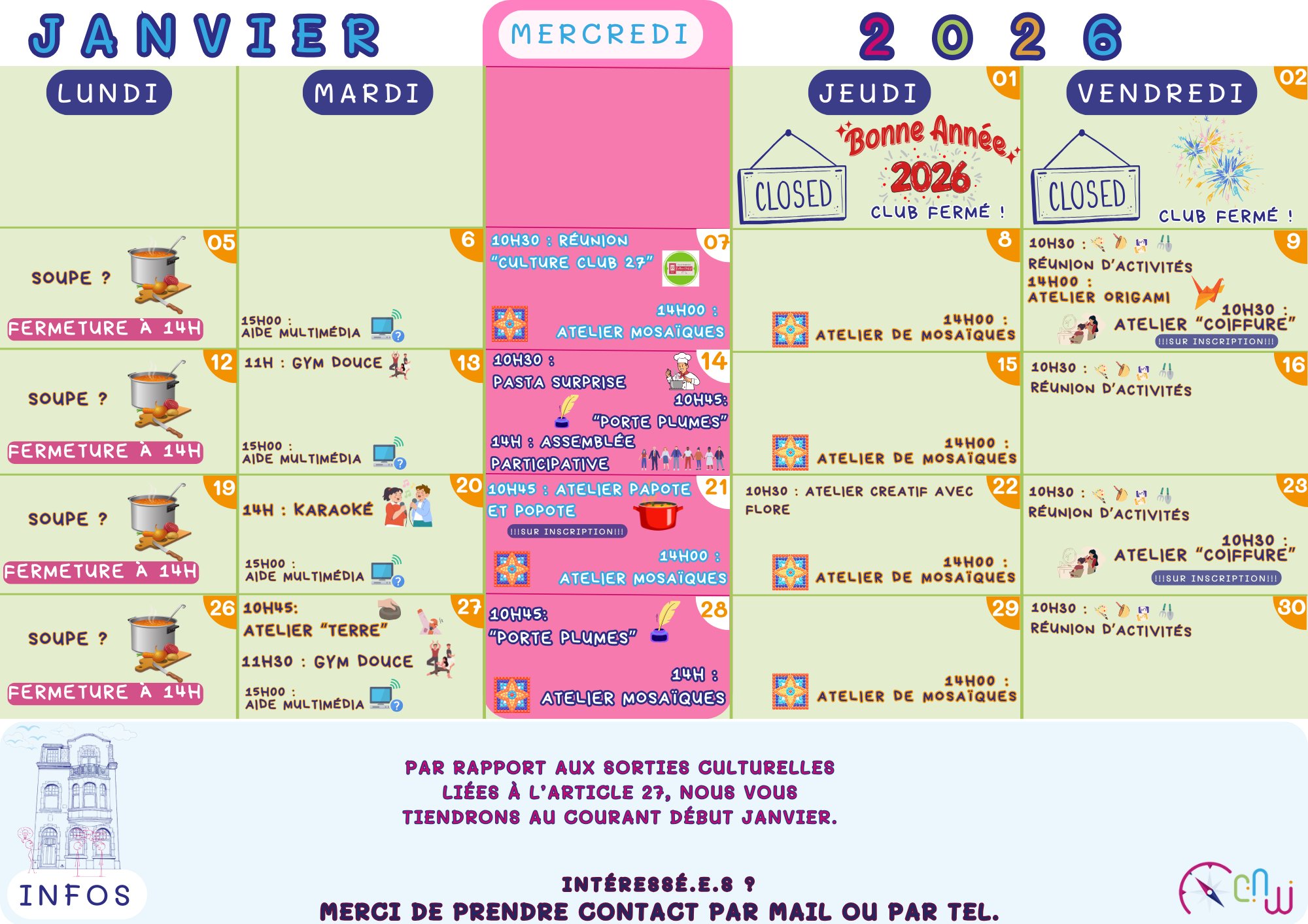 Een zin die vaak terugkomt met betrekking tot mogelijke activiteiten is "niets is verplicht, alles is mogelijk". De activiteiten in het Club worden meestal georganiseerd door of met de leden. Het kernidee van het Club met betrekking tot activiteiten en workshops is dat iedereen een bepaalde kennis heeft, iedereen heeft iets om te delen. Sommige activiteiten worden opgezet in samenwerking met partnerorganisaties, zowel binnen het Club als daarbuiten.